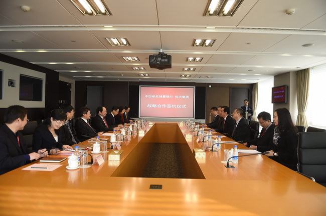 2月3日,中国邮储银行与恒大在邮储银行总部签订战略合作协议,建立全面、深入、广泛的长期战略合作关系。中国邮储银行董事长李国华、行长吕家进,集团董事局主席许家印、总裁夏海钧,以及双方其他高管出席了签约仪式。吕家进行长与夏海钧总裁分别代表双方签署战略合作协议。