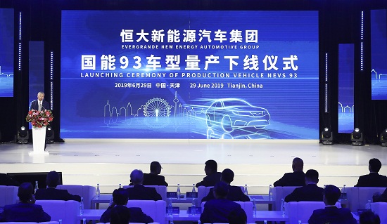 6月29日,恒大新能源汽车集团国能93车型量产下线仪式在天津举行。天津市高新区工委书记单泽峰、恒大集团董事局副主席兼总裁夏海钧、恒大集团董事局副主席兼恒大新能源汽车集团董事长蒋大龙、瑞典科尼赛克董事长Christian von Koenigsegg,瑞典NEVS总裁Stefan Tilk,河钢集团董事长于勇,恒大新能源汽车集团总裁肖恩,荷兰e-Traction首席执行官Steven Hsieh、首席技术官Peter van der Wal,英国Protean首席执行官KwokYin Chan、总裁Andrew Whitehead、首席技术官Chris Hilton等领导嘉宾出席了活动。